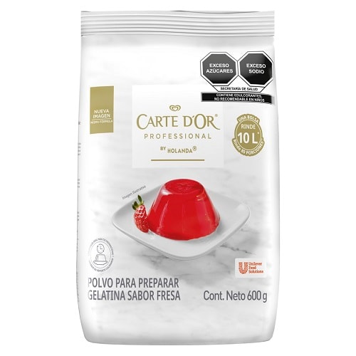Azúcares añadidos (azúcar), grenetina, reguladores de acidez (ácido fumárico y citrato de sodio), saborizante, edulcorantes [aspartame (0.30 g /100 g) y acesulfame K (0.19 g /100 g)] y colorantes artificiales (carmoisina, tartrazina y amarillo ocaso FCF). *FENILCETONÚRICOS: CONTIENE FENILALANINA.